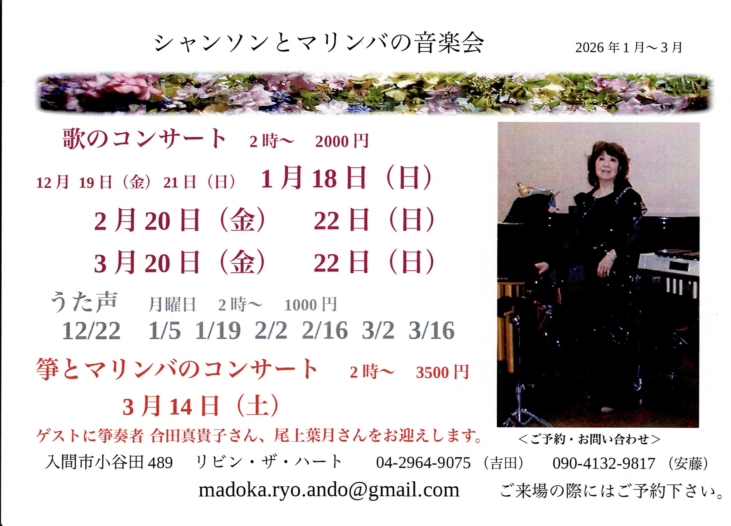 マリンバや歌とのアンサンブルでクラシック、ポップス、邦楽曲をお楽しみいただけます。